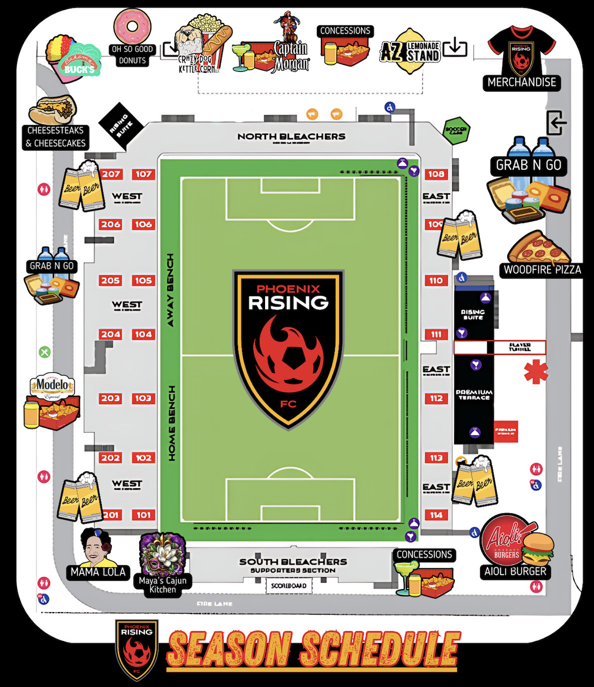 Starting on the north side of the stadium and moving counter clockwise: AZ Lemonade Stand, Crazy Dog Kettle Corn Popcorn, Oh So Good Donuts, Bahama Bucks, Cheesesteaks & Cheesecakes, Grab N Go, Mama Lola’s, Maya’s Cajun Kitchen, Pizza Arno, Zoyo Neighborhood Yogurt, and Grab N Go.