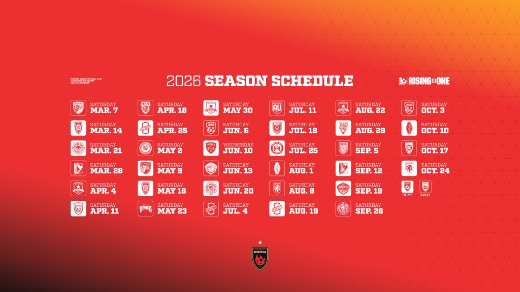 Phoenix Rising FC today announced its 2026 regular season schedule ahead of its 10th Anniversary Season. The schedule features at least 35 matches between a 30-game regular-season slate, four matches in the Prinx Tires USL Cup and at least one match in the Lamar Hunt U.S. Open Cup. Official kickoff times for all matches will be announced at a later date.